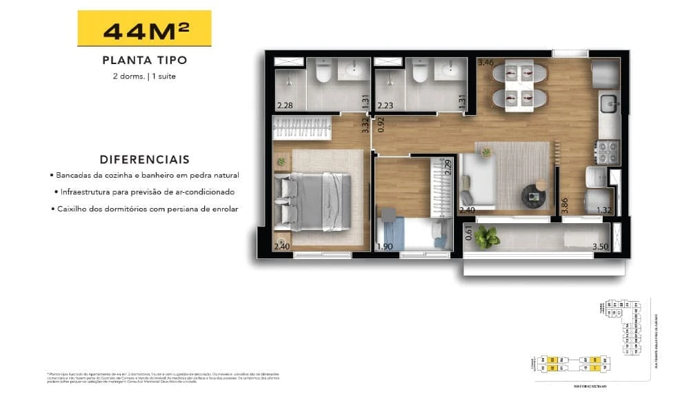 88 unidades de 44,48 m² - 1 SUÍTE + 1 DORMITÓRIO OU 1 SUÍTE + LIVING AMPLIADO